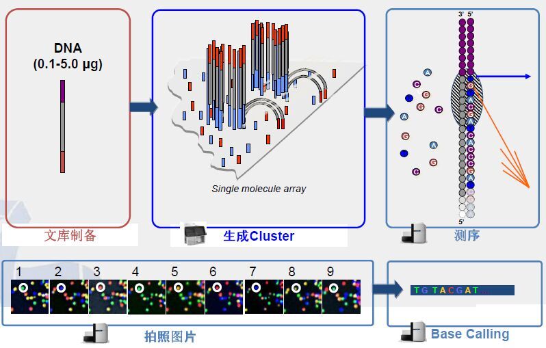 現(xiàn)在市場(chǎng)上占優(yōu)勢(shì)的高通量測(cè)序方法是Solexa法。它是一種基于邊合成邊測(cè)序技術(shù)(Sequencing-By-Synthesis,SBS)的新型測(cè) 序方法。通過(guò)利用單分子陣列實(shí)現(xiàn)在小型芯片(FlowCell)上進(jìn)行橋式PCR反應(yīng)。由于新的可逆阻斷技術(shù)可以實(shí)現(xiàn)每次只合成一個(gè)堿基,并標(biāo)記熒光基 團(tuán),再利用相應(yīng)的激光激發(fā)熒光基團(tuán),捕獲激發(fā)光,從而讀取堿基信息。