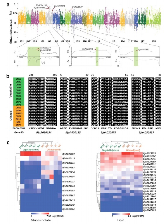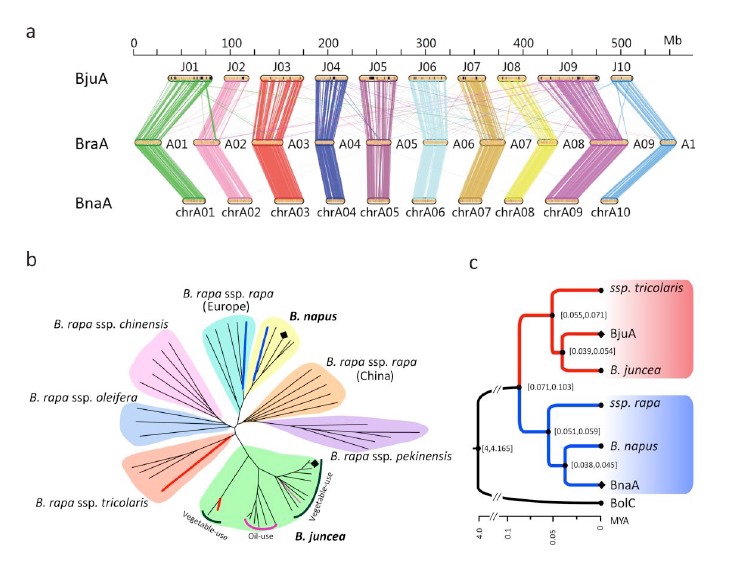 我們對(duì)10個(gè)菜用的芥菜、7個(gè)油用的芥菜,5個(gè)甘藍(lán)型油菜基因組、27個(gè)白菜基因組(多亞種)進(jìn)行了重測(cè)序分析,并繪制如上圖b中的進(jìn)化樹(shù)。從b圖中可以看到芥菜全部聚在一起,沒(méi)有出現(xiàn)分散的情況,說(shuō)明芥菜中A的基因組是來(lái)源于同一個(gè)亞種,屬于單系起源。