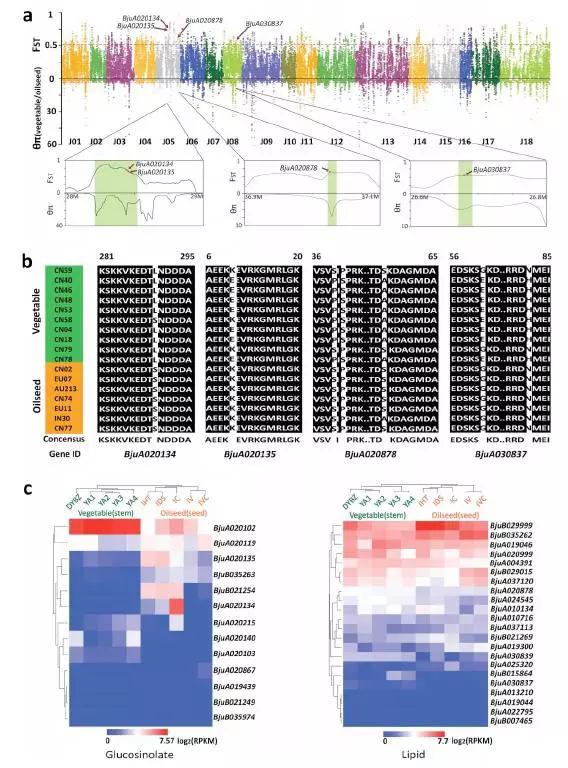 通過菜用和油用芥菜群體進(jìn)行選擇清除分析,發(fā)現(xiàn)dominance的基因被篩選出來的比例較高,同時(shí)結(jié)合轉(zhuǎn)錄組數(shù)據(jù),這部分基因在油用和菜用兩個(gè)群體中差異表達(dá)。同時(shí)通過上面的分析發(fā)現(xiàn)與硫苷,脂類代謝顯著相關(guān)并且存在dominance的基因組,這些基因在油用菜用群體中有各自獨(dú)特基因分型。