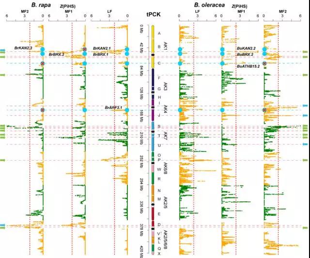 圖3. ?蕓薹(左)和甘藍(lán)(右)亞基因組的選擇信號(hào)檢測(cè)