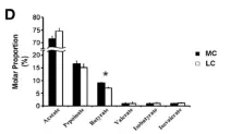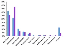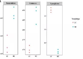 在細菌門水平,一共有14個原核的門被鑒定,主要是厚壁菌門(35.7-30.1%),擬桿菌門(26.6-43.6%)、互養(yǎng)菌門(11-7%),且通過門水平維恩圖分析發(fā)現(xiàn),在兩組(MC和LC)間門水平組成相同,比較分析兩組間微生物變化情況發(fā)現(xiàn)(如圖:FIG2),MC組相比于LC組,互養(yǎng)菌門增長了57%,無壁菌門增長了330%。而黏膠球形菌門降低了63%,纖維桿菌門降低了65%;
