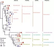 在門水平,MC組的擬桿菌門和厚壁菌門顯著性高于Lc組(P<0.05),互養(yǎng)菌門顯著性低于Lc組(如下圖4),通過最大似然法(ML)計算27個豐度大于1% 的OTU進行分析顯示,在MC組顯著增加的OTU屬于子單胞菌科,疣微菌科、韋榮球菌科、疣微菌門,相反的,58%(7/12)顯著降低的OTU屬于普雷沃氏菌科(如下圖5);
