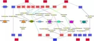 為了研究GPR和HDAC共表達網(wǎng)絡(luò)的生物學(xué)意義,改研究注釋了相關(guān)的信號通路和KEGG功能,發(fā)現(xiàn)顯著差異的鄰近基因被分類到瘤胃上皮細胞的生理調(diào)節(jié)過程,因此發(fā)現(xiàn)了兩類和上皮細胞生長調(diào)節(jié)有關(guān)系的功能網(wǎng)絡(luò),其中一類是上皮細胞生長網(wǎng)絡(luò)(包括細胞凋亡,增殖和分化,見下圖7),另外一類是上皮細胞的代謝網(wǎng)絡(luò)(包括輔酶因子和維生素代謝,能量代謝、氨基酸代謝等,見下圖8);