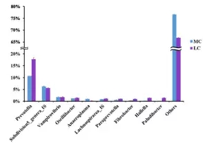 在細菌屬水平。共鑒定出75個屬水平細菌,在兩組間共有70個屬,在MC組有三個特有的屬,在LC水平有2個特有的屬,普氏菌屬(10.4-17.9%)在兩組間都為主要屬水平的菌。