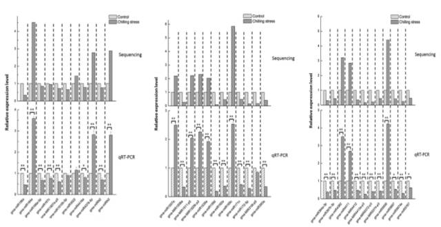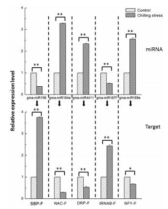對相應(yīng)靶基因進(jìn)行功能注釋來研究差異表達(dá)的miRNA可能行使的功能。差異表達(dá)的miRNA可以分為四類。第一類包括miRNA家族(miR156、miR164、miR169、miR4412和miR5327),靶基因為轉(zhuǎn)錄因子SBP、NAC、NFY、GRAS和bHLH,參與調(diào)控基因表達(dá)和信號傳導(dǎo)。第二類包括miR4411,其對應(yīng)靶基因涉及抵御疾病。第三類包括miR5761、miR159、miR5667、miR1535、miR511、miR4382和miR4416,其對應(yīng)靶基因參與植物生長發(fā)育中的適應(yīng)性。為了進(jìn)一步確認(rèn)冷脅迫下miRNA和靶基因的關(guān)系,選擇了5個miRNAs及其靶基因進(jìn)行qRT-PCR驗證。結(jié)果表明,在冷脅迫下miRNA-164a,miRNA-4411和miRNA-169e上調(diào)。相反的,他們的靶基因NAC、DRP和NFY顯著下調(diào)。說明miRNA和對應(yīng)靶基因呈負(fù)相關(guān)性。