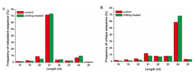 對照組和處理組分別獲得6559098和8273245 clean reads。長度為21nt所占比例*高(圖1A)。非冗余的reads,長度分布統(tǒng)計可以看出24nt所占比例*高,在對照組和處理組中分別為68.4%和59%(圖1B)。