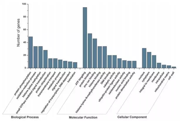為了近一步確認(rèn)這些差異表達(dá)miRNA的功能,對靶基因進(jìn)行GO分析。靶基因共參與了56個分子功能terms,37個生物學(xué)過程terms和7個細(xì)胞組分terms。在分子功能分類下,ATP結(jié)合、蛋白結(jié)合、組蛋白結(jié)合等terms是顯著富集的。超過35%miRNAs的靶基因參與了生物學(xué)過程途徑。