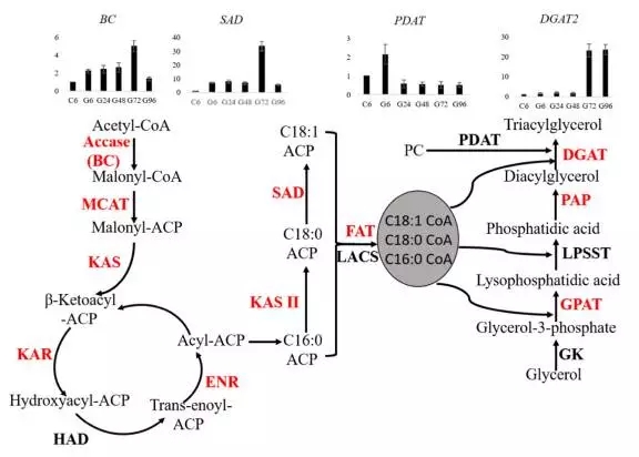 藻類和植物中脂肪酸的生物合成主要在葉綠體中進(jìn)行。乙酰-CoA作為合成的起始物質(zhì)。基于轉(zhuǎn)錄組測(cè)序,小球藻質(zhì)體中脂肪酸合成基因被鑒定到。在葡萄糖處理情況下,這些基因大都表達(dá)量上調(diào)。另外這次測(cè)序結(jié)果中還發(fā)現(xiàn)幾個(gè)基因?qū)?yīng)的不同轉(zhuǎn)錄本。由于BC和SAD是脂肪酸合成的限速酶基因,做了進(jìn)一步分析,發(fā)現(xiàn)BC和SAD表達(dá)量從6h到72h表達(dá)量持續(xù)上升,對(duì)應(yīng)的三酰甘油含量從24h到96h持續(xù)增加。