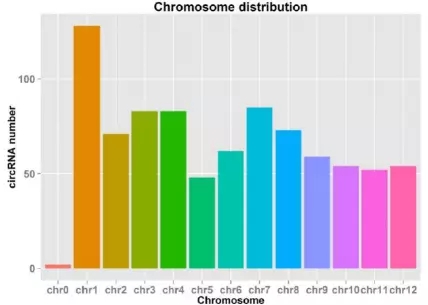 2.染色體來源分析發(fā)現(xiàn),1號染色體產生的circRNA最多。