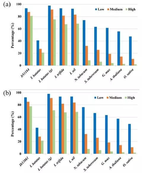 為了評估甘薯、野生甘薯的轉(zhuǎn)錄本和其他植物基因的相似性,我們比較了甘薯、野生甘薯與其他植物的開源CDS數(shù)據(jù)庫,包括紅苔藤、野生甘薯、牽?;ā煵?、馬鈴薯、大豆、擬南芥和水稻。結(jié)果表明甘薯和野生甘薯大多數(shù)的轉(zhuǎn)錄本都是同源的,說明這兩個物種擁有一個大致相同的基因庫。觀察高比例的轉(zhuǎn)錄本發(fā)現(xiàn),盡管這些物種中的大量基因在進化過程中存在著巨大的差異,但仍然共有一些短的motif,說明這些基因在進化上顯示出高度的保守性。
