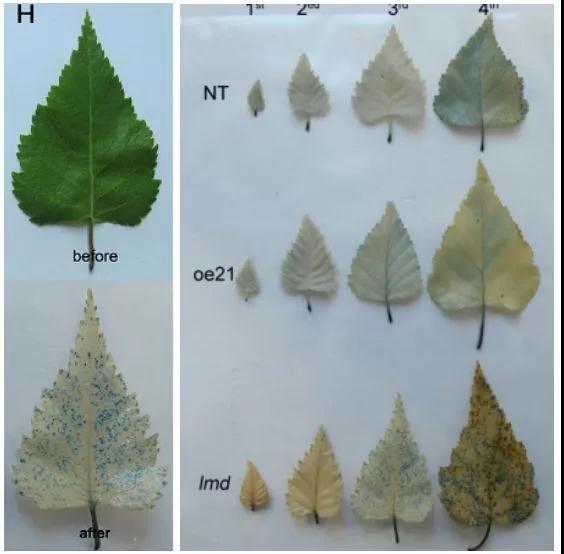 作者在研究BpGH3.5在樺樹中的功能時偶然獲得了lmd突變體。構(gòu)建的21株OE-GH3.5株系中,唯獨lmd葉片表現(xiàn)出壞死斑點并伴有早衰的現(xiàn)象。這很明顯是一種病變的表現(xiàn),當(dāng)這種情況出現(xiàn),很顯然我們要思考兩個問題: