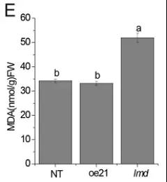 類病變突變體通常會表現(xiàn)出自發(fā)性的細(xì)胞程序性死亡(PCD),作者通過伊文思藍(lán)染色比較了lmd與NT、oe21的細(xì)胞死亡情況(圖4);丙二醛含量檢測間接反映了lmd細(xì)胞損壞程度也更高(圖5);