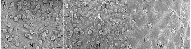 細(xì)胞程序性死亡經(jīng)常伴隨著細(xì)胞結(jié)構(gòu)的變化,光學(xué)顯微鏡顯示lmd突變體的死細(xì)胞聚集在一起,而周圍的細(xì)胞是正常結(jié)構(gòu)的,死細(xì)胞并沒有明顯擴(kuò)散痕跡(圖6),表明lmd是起始型的類病變突變體。接下來作者用透射電鏡觀察了lmd葉片細(xì)胞的超微結(jié)構(gòu)。與oe21和NT相比,在lmd突變體中觀察到更多的死細(xì)胞,一些細(xì)胞產(chǎn)生吞噬作用,細(xì)胞器消失,只留下一個空細(xì)胞壁(圖7),這一結(jié)果表明了lmd突變體中發(fā)生了典型的細(xì)胞程序性死亡。樺樹葉片上有許多葉腺,在葉片成熟后會退化。由于lmd表現(xiàn)出葉片早衰現(xiàn)象,作者用掃描電鏡掃描葉片表面,以觀察lmd是否有變化。在第三個葉片上,發(fā)現(xiàn)lmd葉片上的葉腺體比NT和oe21葉片少(圖8)。SEM觀察表明,lmd確實發(fā)生了早衰。