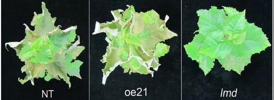 轉(zhuǎn)錄組材料為lmd、oe21、NT,lmd突變體是從BpGH3.5轉(zhuǎn)基因株系中分離出;oe21株系是正常的BpGH3.5轉(zhuǎn)基因株系;對照材料是非轉(zhuǎn)基因的NT。