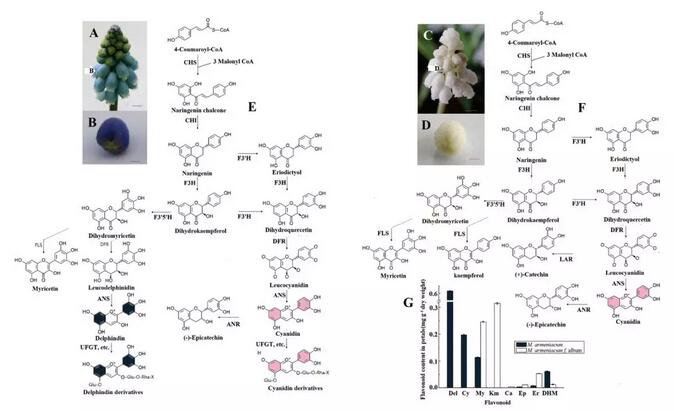 葡萄風信子(Muscari)是一種重要的觀賞性球根植物,具有獨特藍色、花形和甜香。天然突變種白色風信子為探究某些潛在生化特征,特別是顏色相關的復雜代謝網絡研究提供了機會。據報道,花青素是風信子花色的主要色素。藍色花主要由飛燕草色素(Del)決定,紅色花由花青色素(Cy)決定?;ㄇ嗨厥侵参锟茖W中研究最多和最了解的化合物之一,然而,在不同植物中調控花青素分解代謝的分子機制還遠遠沒有定論。