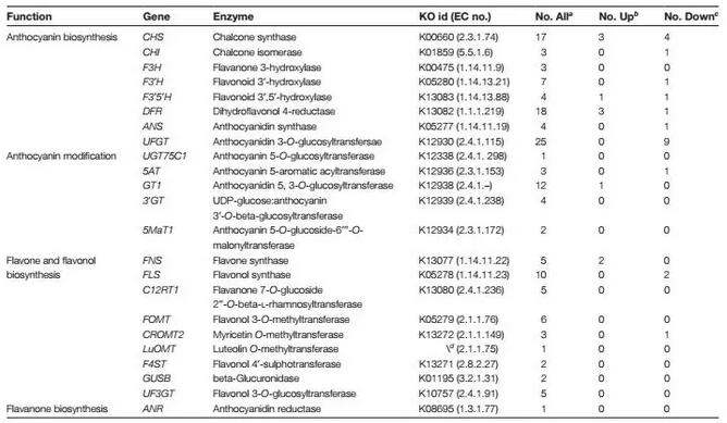 通過轉錄組和代謝組技術,不僅可以對轉錄水平進行研究,還可以對代謝產物進行比較分析,從而深入解析決定表型的分子調控機制。本研究首次使用轉錄組和代謝組聯(lián)合分析,揭示與風信子花色素沉著相關的主要代謝途徑,并且挖掘針對植物中色素沉積相關的關鍵基因。