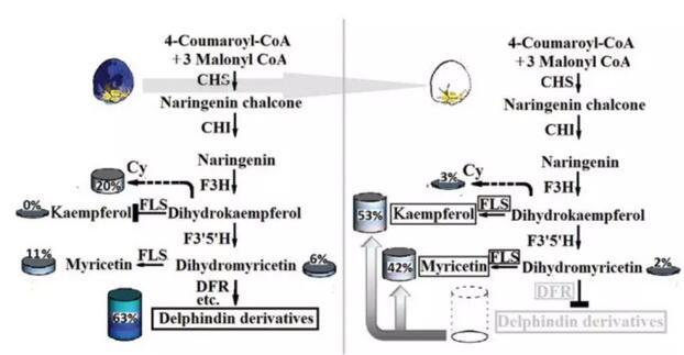 在藍色風信子中檢測到與Del合成相關的部分同源序列的表達上調,在某些情況下,高出> 1000倍。結合HPLC分析結果,DFR可能是白色葡萄風信子中藍色色素沉積(Del)消失的靶基因。另外,F(xiàn)LS和DFR在共同的二氫楊梅素底物之間的強烈競爭,可能部分地阻斷Del的合成并引起其他類黃酮化合物,如楊梅素的產生,由此進一步消除白色風信子中藍色色素沉積。