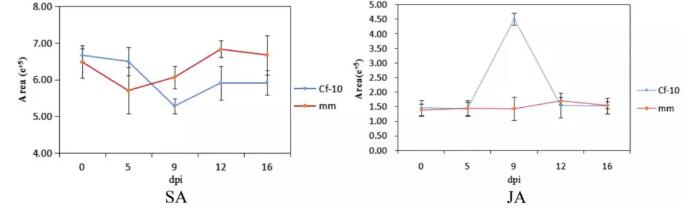 3)如圖3所示, Ontario 792中,SA含量剛開始緩慢下降,然后緩慢上升直到16 dpi。Moneymaker中,SA含量在5 dpi下降至最低水平,然后逐漸增加直到12 dpi。Ontario 792中,從5 ~ 9 dpi JA含量迅速上升到峰值,然后從9到12dpi下降到原始水平,但Moneymaker中始終保持相對(duì)穩(wěn)定,表明JA可能參與激活對(duì)C. fulvum的防御系統(tǒng)。