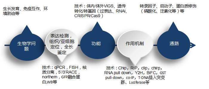 做完這部分基礎的驗證后,就需要驗證基因或ncRNA的功能,功能的驗證主要分兩類:獲得性研究和缺失性研究,獲得性研究即通過VIGS或遺傳轉化/轉基因讓目的基因過表達,缺失性研究即用RNAi、CRISPR/Cas9等技術讓目的基因沉默或突變?yōu)闊o功能基因。通過這部分研究可以驗證目的基因的功能。