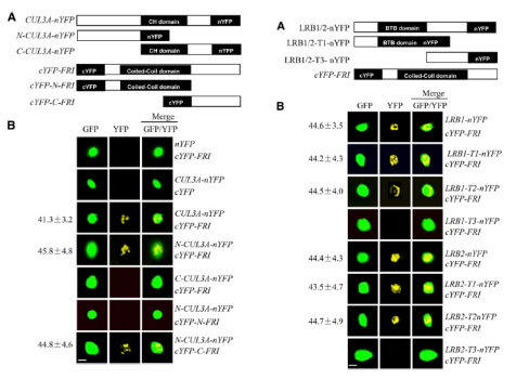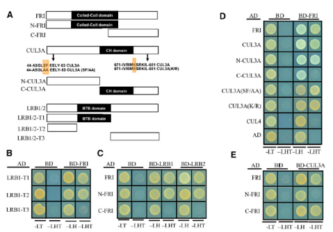 之后在體內(nèi),用BiFC在體內(nèi)驗證定位、酵母雙雜交、GST pull-down結果,用co-IP分析瞬時表達FRI和CUL3A再次驗證相互作用。