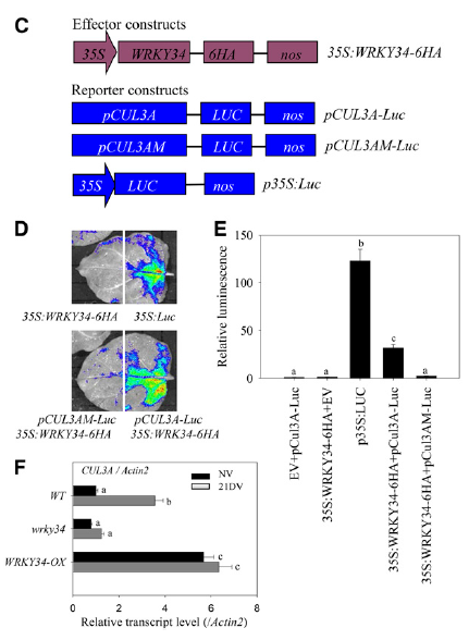 比如上面談到的Plant Cell的文章,作者發(fā)現(xiàn)轉錄因子WRKY34的轉錄迅速被冷應激誘導,之后構建pCUL3A-LUC載體和W-box區(qū)域突變pCUL3A-LUC載體,與WRKY34共注射入煙草和擬南芥葉原生質體,來驗證WRKY34以預測的W-box與CUL3A啟動子結合以增加其CUL3A轉錄,而CUL3A又介導FRI降解調節(jié)擬南芥春化過程中的開花,從而把生物學故事由冷誘導—WRKY34轉錄—CUL3A轉錄—FRI降解—擬南芥春化過程中的開花這樣一條線串起來。