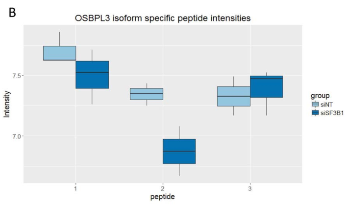 約65%的顯著差異表達(dá)的splice-specific-peptides在RNA水平上表現(xiàn)出一致的表達(dá)差異。例如,下調(diào)SF3B1的實(shí)驗(yàn)組中,OSBPL3 9號(hào)外顯子中分別有3個(gè)支持外顯子保留和1個(gè)支持外顯子去除的peptides被鑒定出來。兩種inclusion specific-peptides表達(dá)明顯較低,而exclusion specific -peptides則與對(duì)照相比表現(xiàn)出較高的表達(dá)量(如圖5所示)。