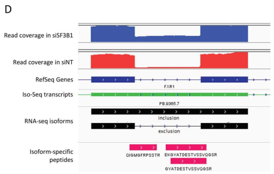 例如,全長(zhǎng)轉(zhuǎn)錄本進(jìn)行測(cè)序結(jié)果支持FXR1內(nèi)含子保留的三種肽段,因此這種內(nèi)含子保留事件也存在于注釋文件中。Illumina 測(cè)到的短 reads支持這一事件,并提供了定量的證據(jù),表明它在SF3B1的下調(diào)過程中比其對(duì)照組(圖6D)更高表達(dá)。