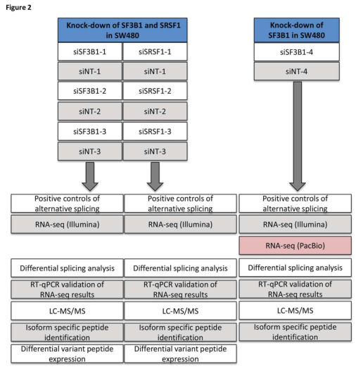 為了測(cè)試splicify這種蛋白組學(xué)數(shù)據(jù)的分析方法,建立了一種可以對(duì)isoform變化進(jìn)行調(diào)控的實(shí)驗(yàn)?zāi)P?,?duì)SW480結(jié)腸癌細(xì)胞系中的剪接因子SF3B1和SRSF1進(jìn)行siRNA干擾以下調(diào)其表達(dá),然后通過RNA-seq和質(zhì)譜進(jìn)行結(jié)果檢測(cè)。