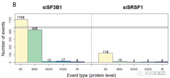 轉(zhuǎn)錄組分析顯示siSF3B1和siSRSF1的可變剪接事件與對(duì)照組相比有顯著差異(圖3A),證明對(duì)剪接因子的操作導(dǎo)致了差異剪接的產(chǎn)生。