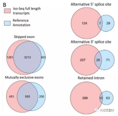 在研究可變剪接方面,Iso-Seq測(cè)到的全長(zhǎng)轉(zhuǎn)錄本對(duì)基因組注釋結(jié)果是一個(gè)極大補(bǔ)充,尤其在內(nèi)含子保留、3 ‘可變剪接和5 ‘端可變剪接事件中,Iso-Seq測(cè)到的全長(zhǎng)轉(zhuǎn)錄本與基因組注釋的重疊較小。這表明,基因組注釋中缺少一些完整的或部分的內(nèi)含子序列可變剪接的isoform形式。