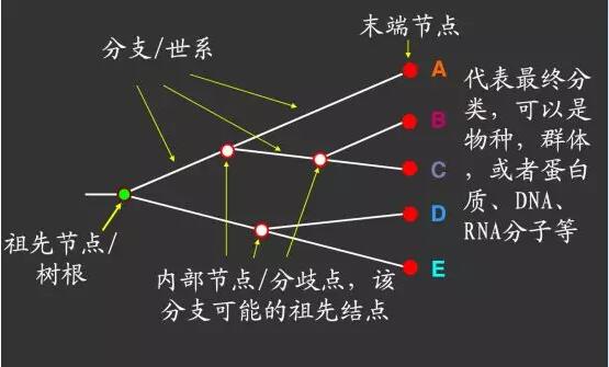 系統(tǒng)發(fā)育分析中,最重要和最常見的內(nèi)容為構(gòu)建系統(tǒng)發(fā)育樹。系統(tǒng)發(fā)育樹也稱為系統(tǒng)發(fā)生樹(phylogenetic tree)、聚類樹或者進(jìn)化樹(evolutionary tree)。以樹狀結(jié)構(gòu)表示各個(gè)節(jié)點(diǎn)的進(jìn)化關(guān)系,枝點(diǎn)可以是物種、同一物種的樣本、基因等單元。系統(tǒng)進(jìn)化樹中各個(gè)元素的介紹如圖1所示