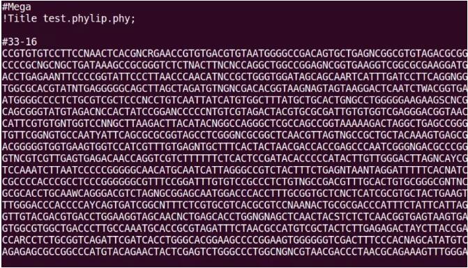 VCF轉(zhuǎn)MEGA格式。用TASSEL打開VCF文件,另存為Phylip格式(Save As — ?Phylip(Interleaved)),如圖3,然后用MEGA7把Phylip文件轉(zhuǎn)換成MEGA格式(File — Convert File Format to MEGA — 選擇剛才轉(zhuǎn)出的Phylip文件按提示操作存成.meg文件),轉(zhuǎn)出的格式如圖4,前兩行為文件頭信息,無實(shí)際意義,但是必有?!?33-16”表示樣本編號,與fasta文件的格式不同,mega格式樣本的起始不是“>”而是“#”,接下來便是該樣本的SNP連接成的序列信息。