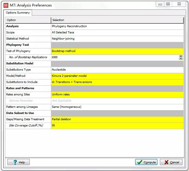參數(shù)設(shè)置,主要填寫B(tài)ootstrap值,一般選擇500或1000次;Model一般用Kimura 2-parameter Model(K2),如果K2模型運(yùn)行不了,可以換成p-distance模型;Gaps/Missing Data Treatment選擇Partial deletion或者pairwise deletion,選擇complete deletion時(shí)帶有缺失值的標(biāo)記都會被刪除,所以必須謹(jǐn)慎;Site Coverage Cutoff與我們常說的完整度相同,一般填寫成我們過濾標(biāo)記時(shí)使用的完整度,上述參數(shù)設(shè)置完成后,點(diǎn)擊compute即可。(見圖6)