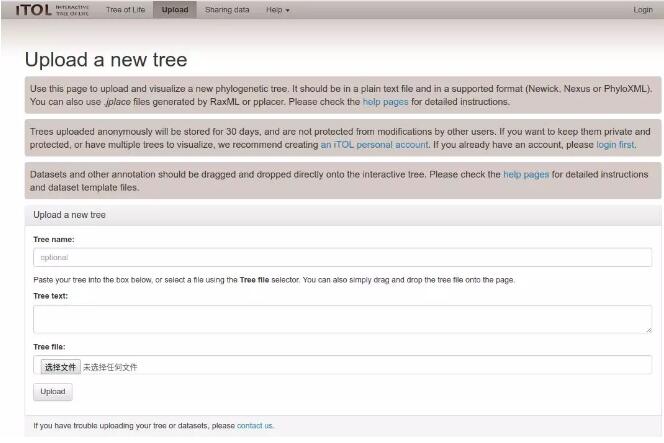 1、打開iTOL主頁以后,選擇上端的Upload選項(xiàng),出現(xiàn)輸入界面后,可以在Tree text框中粘貼nwk中的內(nèi)容,也可以通過【選擇文件】選項(xiàng)選擇需要展示的進(jìn)化樹,之后點(diǎn)擊Upload即可。