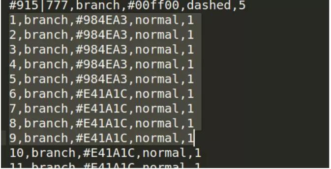 2、進(jìn)化樹著色,按照iTOL的要求,填寫一個(gè)顏色配置文件,填寫方法如該鏈接的說明https://itol.embl.de/help/colors_styles_template.txt,給末端分枝著色的配置文件填寫如下圖,[2,branch,#984EA3,normal,1]中2為樣本ID,branch表示給樹枝上色,#984EA3為16進(jìn)制顏色代碼,normal表示線條的樣式為正常的實(shí)線,1表示枝條的大小為1,該文件必須以.txt結(jié)尾,填寫完成后,將其拖入進(jìn)化樹的界面即可。