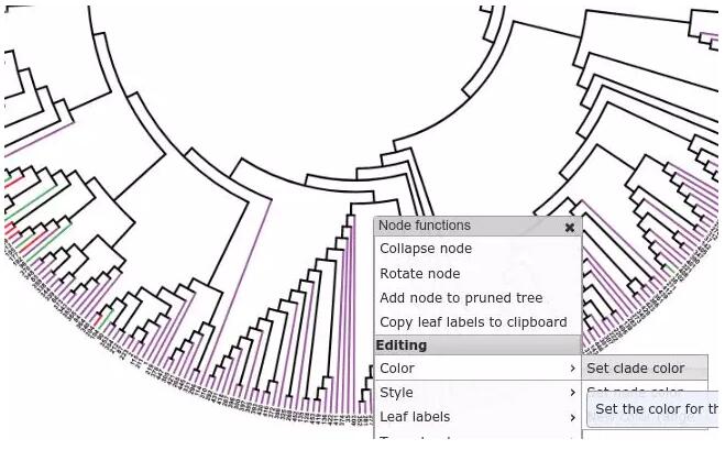 4、分枝顏色的統(tǒng)一。上面的著色例子只對末端分枝進(jìn)行了著色,有時(shí)候,我們需要對某個(gè)分枝的樣本進(jìn)行顏色的統(tǒng)一,可以選中該分枝并點(diǎn)擊鼠標(biāo),在彈出的下拉框中選擇color — set clade color — 選擇想用的顏色或填入對應(yīng)的顏色代碼即可。