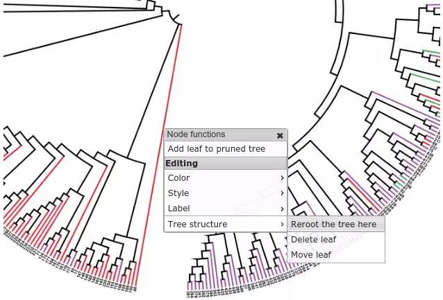 5、樹根的指定。選擇需要指定為根的枝點(diǎn),在彈出的下拉框中選擇Tree structure — Reroot the tree here即可。