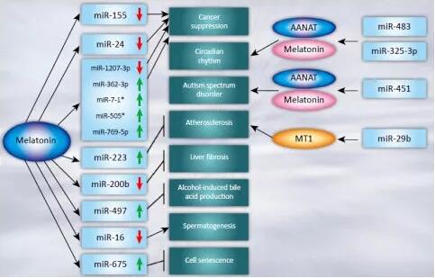 近年來(lái),全轉(zhuǎn)錄組測(cè)序研究越來(lái)越多,拓展了我們對(duì)非編碼RNA的認(rèn)知,也發(fā)現(xiàn)了褪黑激素與非編碼RNA之間存在的功能互作,比如褪黑激素可以通過(guò)與特定的miRNA通路的功能互作,對(duì)癌癥的發(fā)展、腦環(huán)境、肝纖維化、自閉癥譜系障礙ASD、動(dòng)脈粥樣化形成和精子發(fā)生等起調(diào)節(jié)作用;有研究通過(guò)RNA測(cè)序,研究了大鼠松果體中l(wèi)ncRNA每天的晝夜豐度變化,或相比于其它組織混合RNA樣本相對(duì)高表達(dá)的lncRNAs,表明脊椎動(dòng)物節(jié)律生物學(xué)中l(wèi)ncRNAs的動(dòng)態(tài)作用。