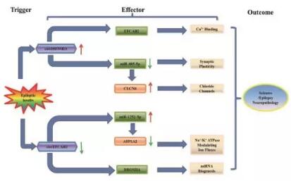 最近的基因組學研究揭示了許多與各種疾病的基因調控相關的非編碼RNA (ncRNAs)。人類癲癇中非編碼RNA的表達也發(fā)生了改變,可以作為一種新的、非侵入性的生物標志物來改善目前的癲癇診斷。環(huán)狀RNA (circRNAs)是一種獨特的非編碼環(huán)狀RNA,circRNA與microRNAs (miRNAs)相互作用,并作為miRNA海綿,通過circRNA-miRNA-mRNA網(wǎng)絡在神經(jīng)系統(tǒng)疾病中調節(jié)基因表達。研究表明環(huán)狀RNA在神經(jīng)元功能中發(fā)揮重要作用,尤其是在突觸中。組織學研究結果證實,邊緣系統(tǒng)的突觸重組似乎能逐漸增強皮質興奮性,并可能導致癲癇發(fā)作。然而,circRNAs在癲癇中的作用仍是未知的。