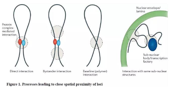 這些3C及其衍生技術(shù)報(bào)告了細(xì)胞群體中兩個(gè)基因座空間上緊密接近的頻率,但未區(qū)分功能性與非功能性的位點(diǎn)間關(guān)聯(lián),也未揭示導(dǎo)致其共定位的機(jī)制。空間上緊密接近包括以下幾種情況:1)Direct interaction:兩個(gè)基因座之間直接、特異性接觸的結(jié)果(由結(jié)合它們的蛋白質(zhì)復(fù)合物介導(dǎo));2)Interaction with the same sub-nuclear structures:成對(duì)基因座與相同亞核結(jié)構(gòu)間接共定位的結(jié)果(例如核纖層,核仁、或轉(zhuǎn)錄工廠等)。3)Bystander interaction:在某些細(xì)胞中,由于鄰近的某些遠(yuǎn)程互作或其他約束因素決定的染色質(zhì)纖維的堆積和折疊的造成的非特異性接觸,或者由于擁擠核中的隨機(jī)(非特異性)碰撞導(dǎo)致的非特異性接觸。4)Baseline(polymer) interaction:染色質(zhì)纖維非常長(zhǎng),而且柔韌,染色體具有聚合體性質(zhì),因此,即使在沒有任何特定高階結(jié)構(gòu)的情況下,這個(gè)特征在很大程度上也決定了基因座間相互作用的頻率。