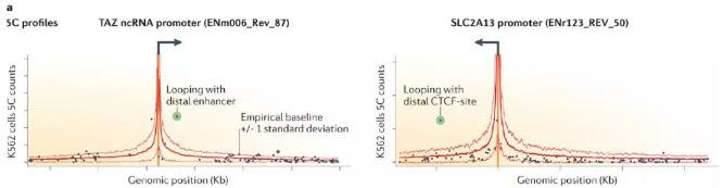 5C技術(shù)通過并行繪制多個(gè)基因座之間的互作圖譜,允許更全面地分析大量基因的染色質(zhì)成環(huán)互作。例如,最近一項(xiàng)研究中,繪制了3種人類細(xì)胞系超過600個(gè)基因啟動(dòng)子的互作圖譜,分辨率:?jiǎn)蝹€(gè)限制性片段(?4Kb)。假設(shè)大多數(shù)交互不是特異的loop交互,從整個(gè)數(shù)據(jù)集中估計(jì)互作頻率的基線值,由此估計(jì)出各基因組距離的互作頻率基線。然后通過檢測(cè)顯著高于該基線的信號(hào),以選定的p值和錯(cuò)誤發(fā)現(xiàn)率鑒定loop互作。與經(jīng)典的3C單基因座對(duì)研究相比,這種方法統(tǒng)計(jì)學(xué)分析上更嚴(yán)格,可以鑒定該基線上的顯著peak。示例見下圖。
