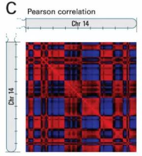 圖片引自Comprehensive mapping of long-range interactions reveals folding principles of the human genome[J]. science, 2009, 326(5950): 289-293,互作矩陣中顏色表示每對(duì)1Mb基因座染色質(zhì)間互作相關(guān)性系數(shù)(紅色:1,藍(lán)色:-1)。