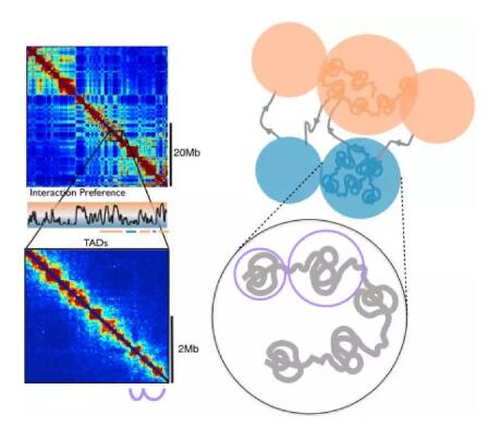 哺乳動(dòng)物基因組的染色體內(nèi)和染色體間相互作用圖揭示了一種相互作用模式,可以近似分為兩個(gè)隔間(A和B,或稱區(qū)室/隔室),它們沿著染色體交替,并且具有約5Mb的特征尺寸。A隔間優(yōu)先與整個(gè)基因組中的其它A隔間相互作用。 同樣,B隔間與其它B隔間相關(guān)聯(lián)。隔間信號(hào)可以通過互作圖的特征向量擴(kuò)展來量化。 A / B室信號(hào)不是簡(jiǎn)單的雙相(僅代表兩種狀態(tài)),而是連續(xù)的,并且與轉(zhuǎn)錄活性指標(biāo),如DNA可及性、基因密度、復(fù)制時(shí)間、GC含量和幾個(gè)組蛋白標(biāo)記相關(guān)。A-隔間主要是常染色質(zhì)-轉(zhuǎn)錄活躍區(qū)域,B-隔間則主要是聚集在一起的異染色質(zhì)(轉(zhuǎn)錄失活區(qū)域)。