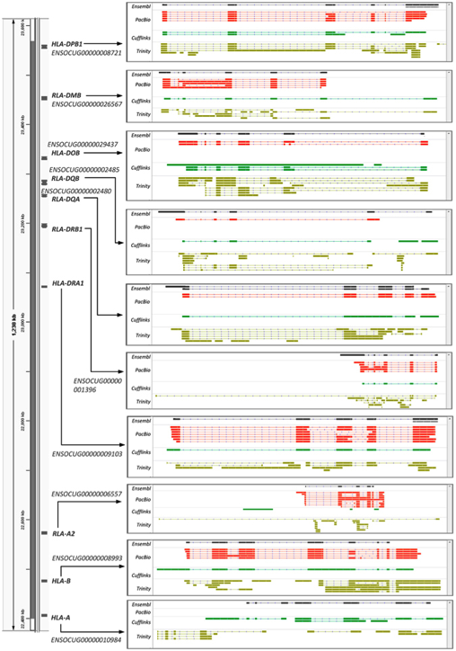 Figure 4.基因通過PacBio所測轉(zhuǎn)錄本和組裝得到的轉(zhuǎn)錄本還原10個MHC基因。染色體定位、命名和每個基因的Ensembl編號(在左側(cè))