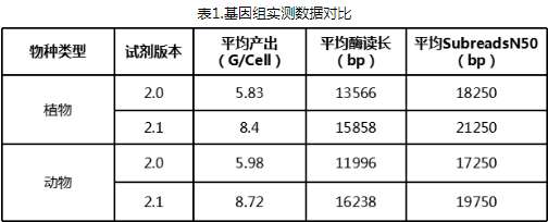 ? ? ? 選取動(dòng)物和植物樣本分別構(gòu)建20K文庫(kù),并對(duì)文庫(kù)進(jìn)行升級(jí)前后的平行實(shí)測(cè)。從數(shù)據(jù)產(chǎn)出的對(duì)比可以看出,較升級(jí)前的6-8G/Cell的平均產(chǎn)出,2.1版本試劑單個(gè)Cell的平均產(chǎn)出有2.5G以上的提升,并且subreads?N50長(zhǎng)度亦有2K以上的提升。這就意味著可以用更少的Cell得到更多且更長(zhǎng)的數(shù)據(jù)。當(dāng)然這些數(shù)據(jù)亦可有效提基因組的組裝和拼接。