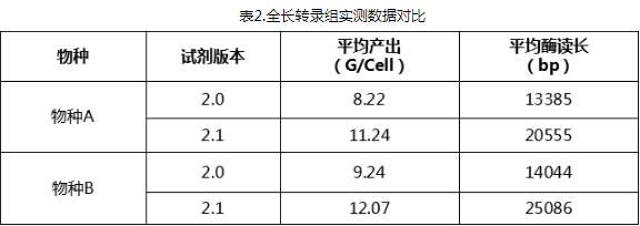 ? ? ? 本次2.1版本試劑的發(fā)布,在全長(zhǎng)轉(zhuǎn)錄上的實(shí)測(cè)亦有優(yōu)異的表現(xiàn)。通過(guò)實(shí)測(cè)發(fā)現(xiàn),2.1版本試劑數(shù)據(jù)產(chǎn)出較升級(jí)前的8-9G/Cell提升到了11-12G/Cell的平均水平。同時(shí),平均酶讀長(zhǎng)也達(dá)到了20K以上。酶讀長(zhǎng)的有效增加,有利于拿到更多的高質(zhì)量全長(zhǎng)轉(zhuǎn)錄數(shù)據(jù),從而有效提高全長(zhǎng)轉(zhuǎn)錄組的分析質(zhì)量。