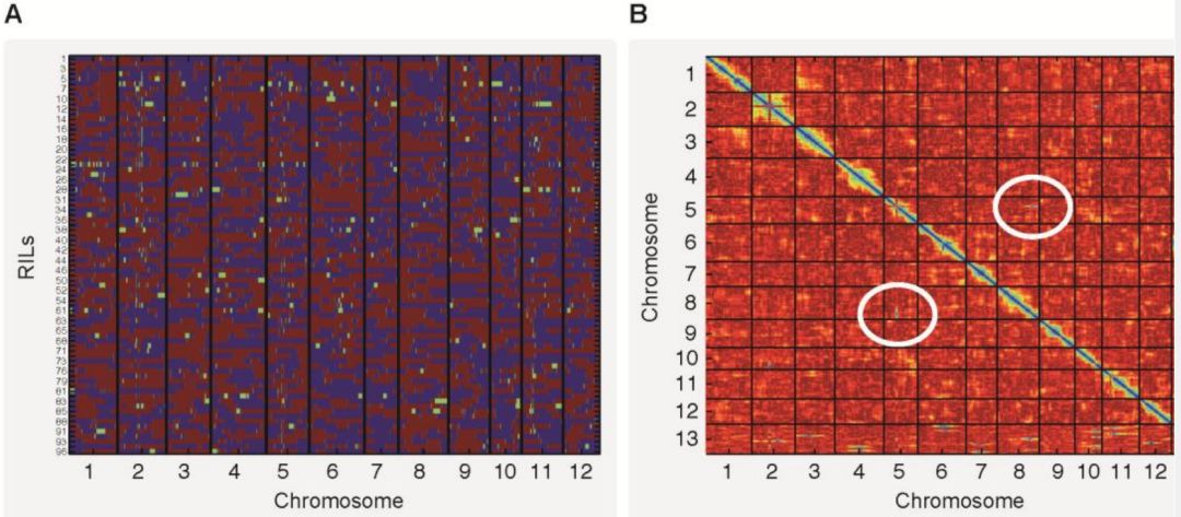 圖1? ? ? ?A)重組bin圖? ? ? ?B)標(biāo)記間關(guān)系熱圖