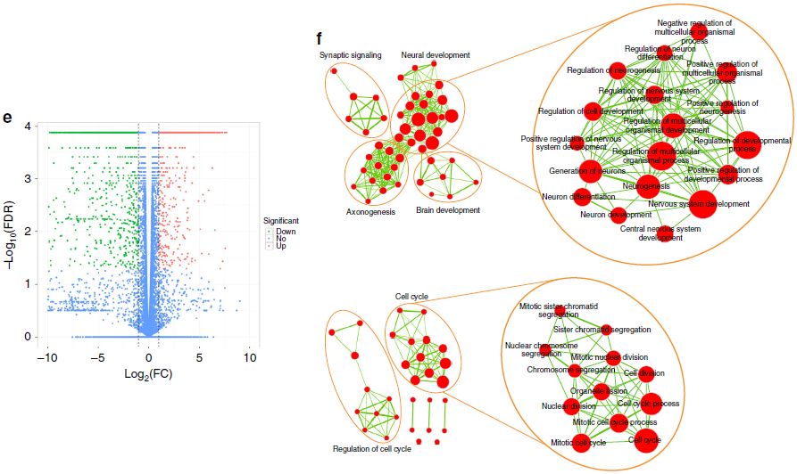 為了進一步確認這些miNSC的NSC身份,作者對miNSC10、SCR029和MEF細胞進行了RNA-seq分析。miNSC10、SCR029和MEF細胞中基因表達水平的散點圖顯示,miNSC10和SCR209細胞的基因表達水平相似,但均與MEF存在顯著差異(圖3a-c)。與這些結(jié)果一致的是,聚類分析也顯示出miNSC10和SCR029細胞之間有很高的相似性,但它們與MEF之間有很大的差異(圖3d)。與MEF相比,miNSC中有許多基因表達水平下調(diào)或上調(diào)(圖3e)。作者對上調(diào)基因進行基因集富集分析(GSEA),發(fā)現(xiàn)了兩組主要的富集基因GO term(圖3f)。其中一組在與神經(jīng)發(fā)育相關(guān)的GO term中富集,如神經(jīng)發(fā)生、神經(jīng)元分化、神經(jīng)系統(tǒng)發(fā)育、神經(jīng)發(fā)生調(diào)節(jié)、大腦發(fā)育和軸突發(fā)生。另一組富集在細胞分裂GO term,包括細胞分裂、有絲分裂細胞周期、核分裂、姐妹染色單體分離、細胞周期調(diào)控。這些數(shù)據(jù)與miNSC作為NSC及其增殖和自我更新能力是一致的。與此一致的是,進一步的分析顯示,盡管有一定的差異,但miNSC10、SCR029、NS528(小鼠ES細胞來源的NSC)和ciNSC10 (化學(xué)誘導(dǎo)MEF形成的NSC)細胞之間的相似性比MEF更大。