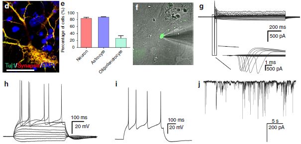 通過突觸素染色標(biāo)記試驗、電生理特性分析表明了miNSC分化的神經(jīng)元具有活性膜特性(圖4d、f-j)。因此,ptf1a重編程的miNSC能夠分化為功能神經(jīng)元。