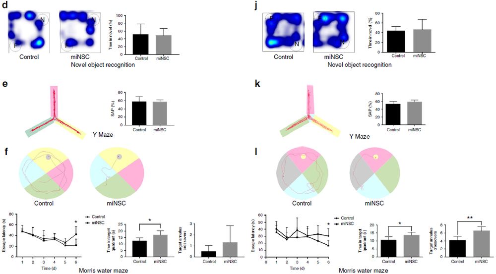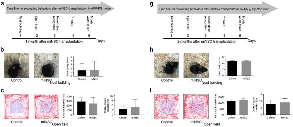 作者也評估了miNSC對β-淀粉樣蛋白1-40(Aβ1-40)損傷AD小鼠模型的治療潛力。首先確定了Aβ1-40損傷小鼠的學(xué)習(xí)和記憶障礙小鼠與AD類似。將GFP標(biāo)記的miNSC在注射Aβ1-40 2周后移植到相同位置。兩個月后,作者進行了同樣的行為學(xué)試驗,發(fā)現(xiàn)移植miNSC可以顯著提高APP / PS1和Aβ1-40損傷AD小鼠模型的空間學(xué)習(xí)和記憶能力,療效與ESC來源的NSC相似(圖6g-k)。